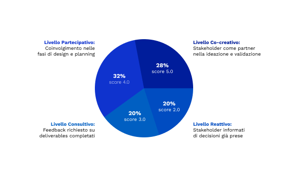 La ricerca mostra una media di 3.68/5.0 nel coinvolgimento degli stakeholder durante il progetto[1], con una variabilità notevole. Questo suggerisce che molte organizzazioni ancora operano con modelli di consultazione reattivi (feedback su outputs completati) piuttosto che proattivi (co-design).