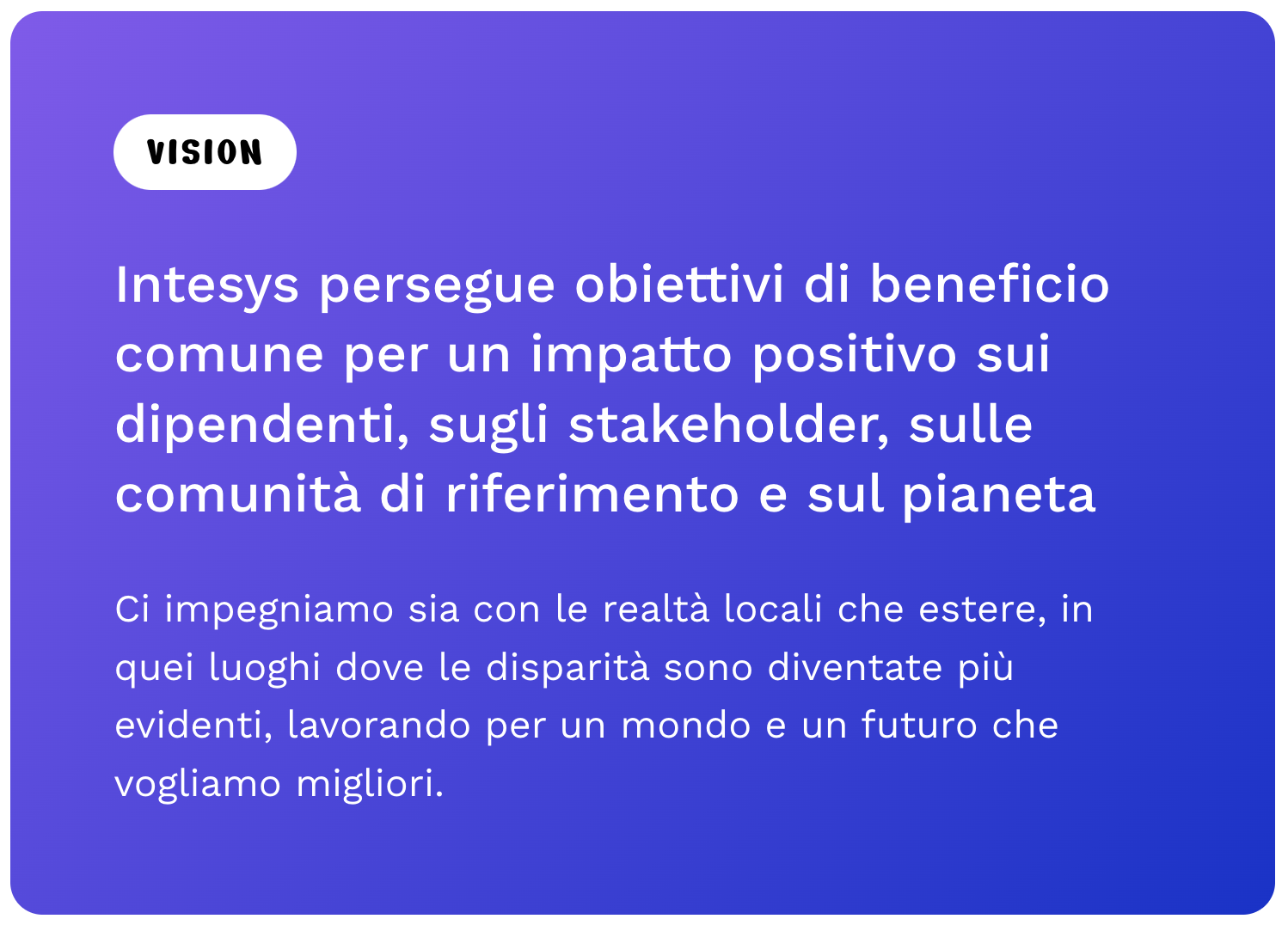 A partire dai risultati ottenuti e dalle aree di miglioramento individuate, abbiamo definito una Mission e una Vision specifiche per il posizionamento ESG. Questi elementi rispecchiano in modo coerente le nostre azioni in questo ambito e ci guideranno nelle future strategie di comunicazione e di engagement. Abbiamo inoltre categorizzato le nostre iniziative ESG e organizzato brainstorming e sessioni creative per individuare il modo migliore di comunicare i temi più complessi.